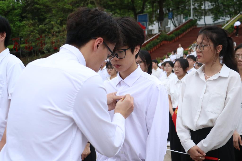 活动在庄严的国歌声中拉开序幕。校级学生骨干代表梁馨月宣读2024年新团员名单,并由历年优秀团员代表为新团员代表佩戴团徽。来自经济学院的李钰同学作为新团员代表发言。学校第十届“榜样之星”思想引领类代表、来自滨海农业学院的李家毅向新团员们寄语,希望新团员立志做有理想的时代青年、做敢担当的时代青年、做有作为的时代青年。最后,全场团员青年代表庄重宣誓并齐唱团歌。