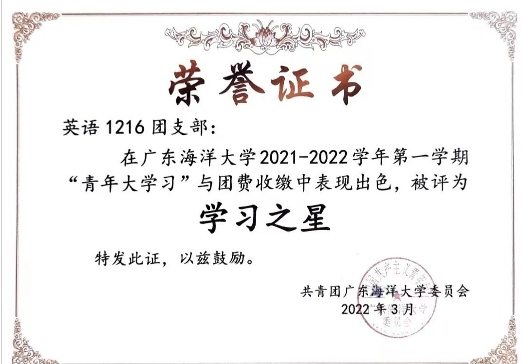 伟德国际1946源于英国外国语学院英语1216团支部成立于2021年8月,现共有团员32名。自成立以来,本支部内的成员积极学习团和党的理论知识,积极配合支部开展的各项工作,热爱集体、团结互助,每月的团费缴纳率达到100%,每期的青年大学习参学记录均超过100%,且本支部于2021-2022学年第一学期因在“青年大学习”与团费收缴中表现出色,被评为“学习之星”。