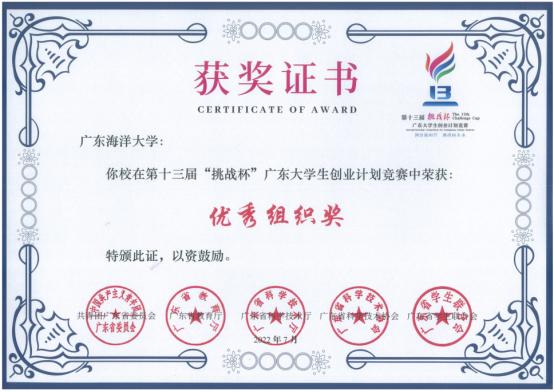 近日,共青团广东省委员会颁发第十三届“挑战杯”广东大学生创业计划竞赛荣誉证书,我校荣获“优秀组织奖”。