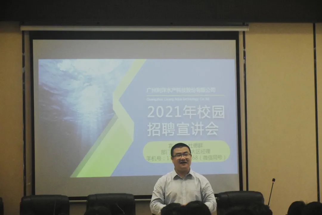 以水产动保为主、苗种开发为辅进行生产销售的广州利洋水产公司的宣讲代表从数字的角度依次阐明该企业的招聘标准以及能给予员工的相关优待与保障。