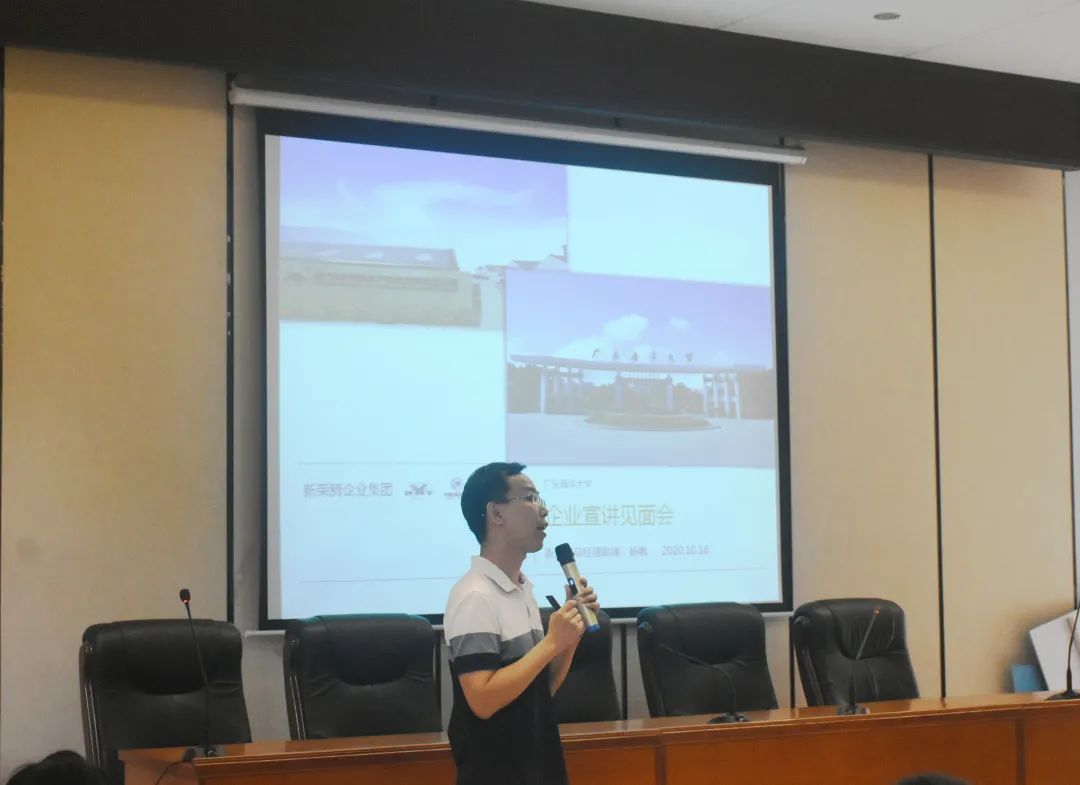 一进入宣讲会现场,几条写着标语的横幅映入众人眼帘,这便是来自海大集团的“热情”。作为首个发言的企业代表,梁师兄在向大家介绍海大集团之时,首先让同学们改变往日里认为从事饲料养殖即是在条件极脏乱差的环境下工作的刻板印象。现如今,该行业已成为科技与智慧共同交织的现代农牧行业,许多工作环节已实现全自动化操作。而海大集团所具备的极大优势便是掌握从研发、生产到销售全产业链的高端技术和较强的科研创新能力。
