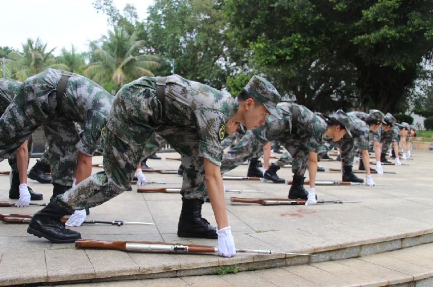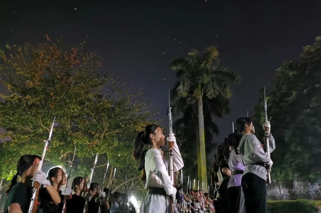 2019年5月29日下午,湛江多地发布暴雨黄色预警,湖光校区暴雨如注,一位国旗护卫队的队员冒着大雨,毅然走向升旗台把国旗收了下来,并扛着国旗踢着正步返回宿舍。