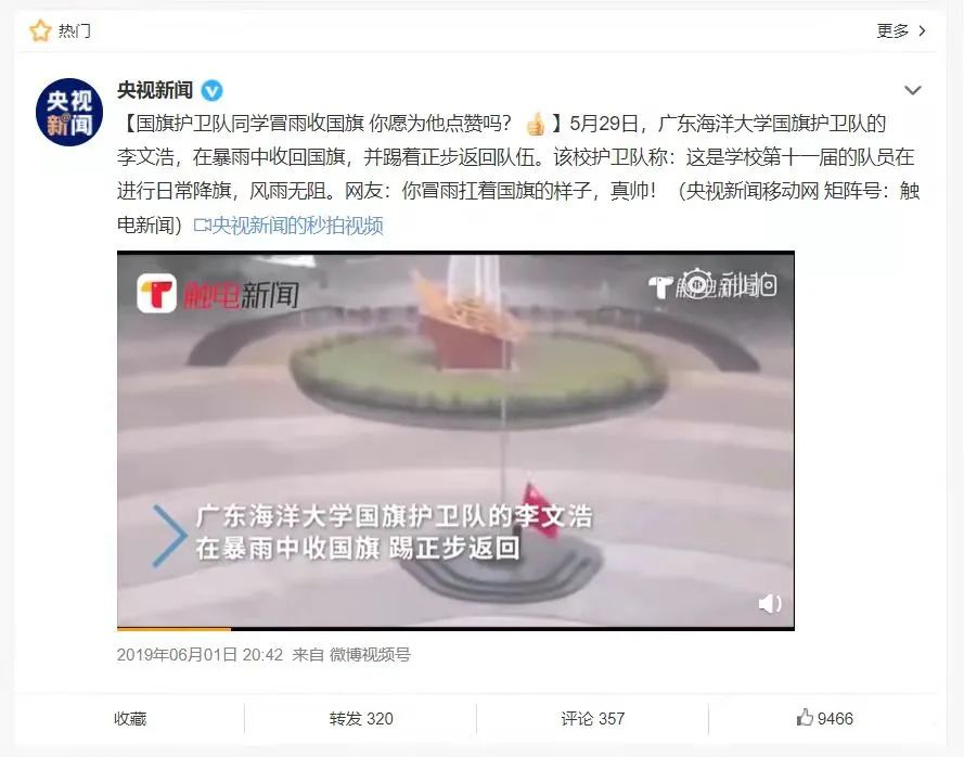 这感人的一幕引来许多人关注和点赞,并获人民日报、中国日报、央视、共青团中央等多家主流媒体报道。网友们纷纷表示,“虽然你淋雨的样子很狼狈,但是你收国旗的样子真帅!”“昨天真的感动哭了,师弟你扛着国旗的样子真是太帅了!”“五星红旗,飘扬在每个中国人心中。”“同护一面旗,共爱一个家。”“少年强,则国强!”“为你点赞,祖国在心中!”
