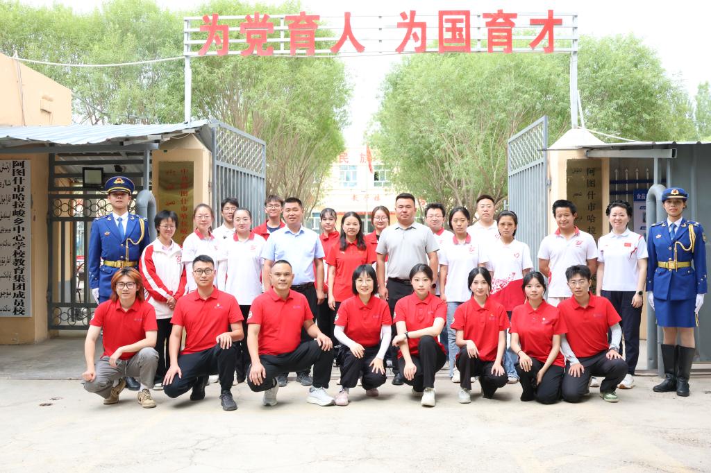 7月10日,我校“山海同心 筑梦新疆”实践团师生赴新疆谢依特小学开展社会实践活动。学校党委副书记谭平,阿图什团市委书记、教育工委副书记王健,校团委书记袁路,阿图什市哈拉峻乡党委委员、武装部部长董涛等参加活动,共同见证这场跨越山海的青春对话。