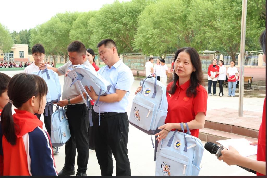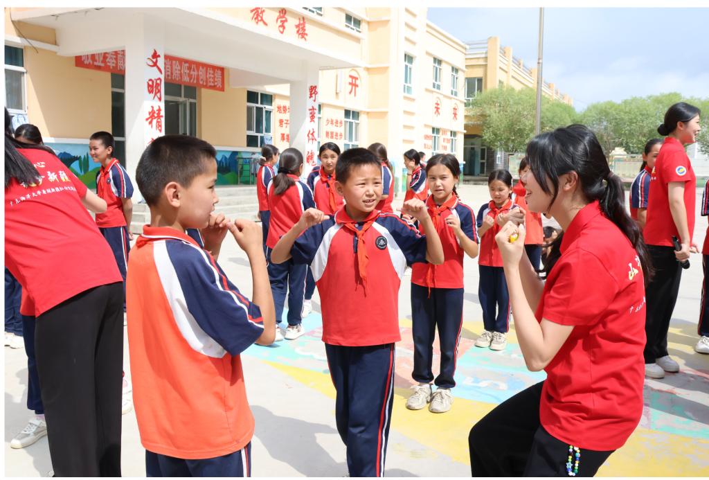 慰问仪式上,我校师生向驻扎新疆的西部计划志愿者致以慰问,并为谢依特小学学生们送去书包。五年级学生努尔扎达将一枚喀什的乳白色贝壳交给实践团成员叶美,请她“放回大海”。志愿者周嘉欣说道:“贝壳承载着边疆孩子对海洋的向往,而书包则见证了我们跨越山海的承诺。”随后,粤疆学子手挽手,用柯尔克孜语和粤语合唱《我和我的祖国》,并参与“语言传声筒”活动。当学生们跳起“黑走马”舞蹈,粤语歌声与柯尔克孜族民歌交织,真挚舞步与轻盈舞姿相映,生动勾勒出民族团结的生动画卷。