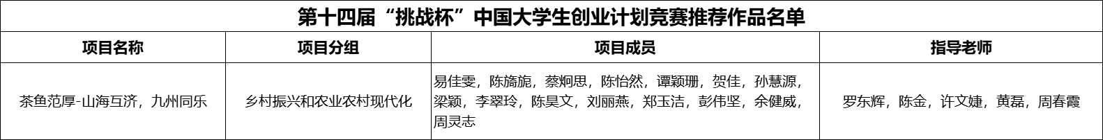 根据第十四届“挑战杯”中国大学生创业计划竞赛赛事安排,结合上级团组织推荐意见及省赛成绩,拟推荐“茶鱼范厚--山海互济,九州同乐”参加第十四届“挑战杯”中国大学生创业计划竞赛,现作公示: